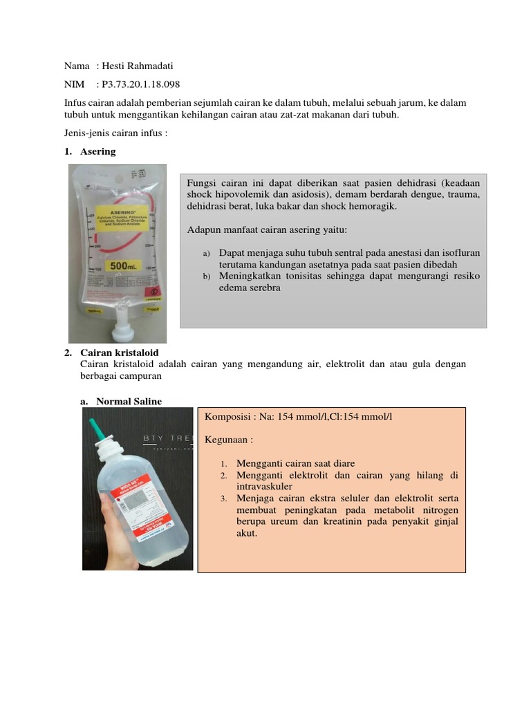 Jika Anda mengonsumsi obat lain atau produk toko pada waktu bersamaan efek dari Aering Infus Asering Infusion in Indonesian dapat berubah. Infus Infus adalah produk parenteral yang digunakan untuk injeksi ke. Penggunaan Apa fungsi ringer laktat.