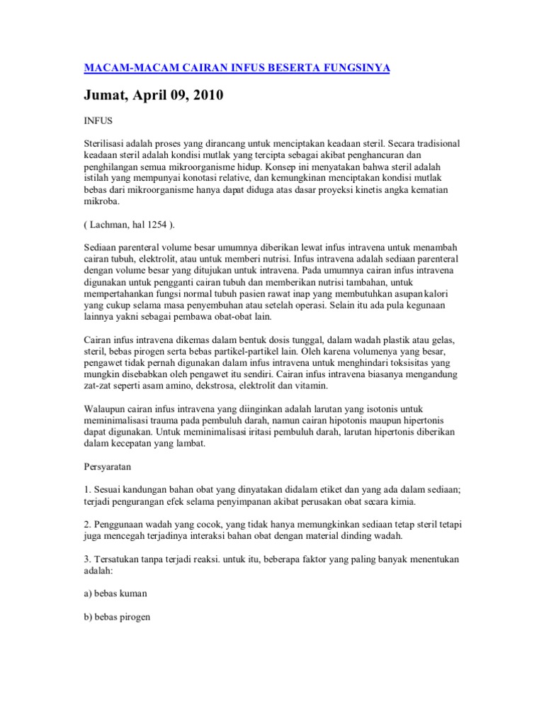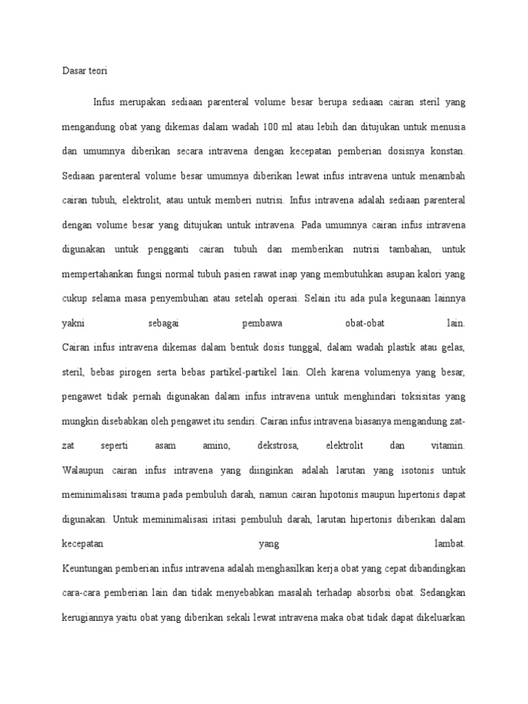 Oleh karena volume yang besar pengawet tidak pernah digunakan dalam infuse. Mengetahui cara pembuatan sediaan infus. IVIG hanya boleh diberikan oleh dokter atau petugas medis di bawah pengawasan dokter.